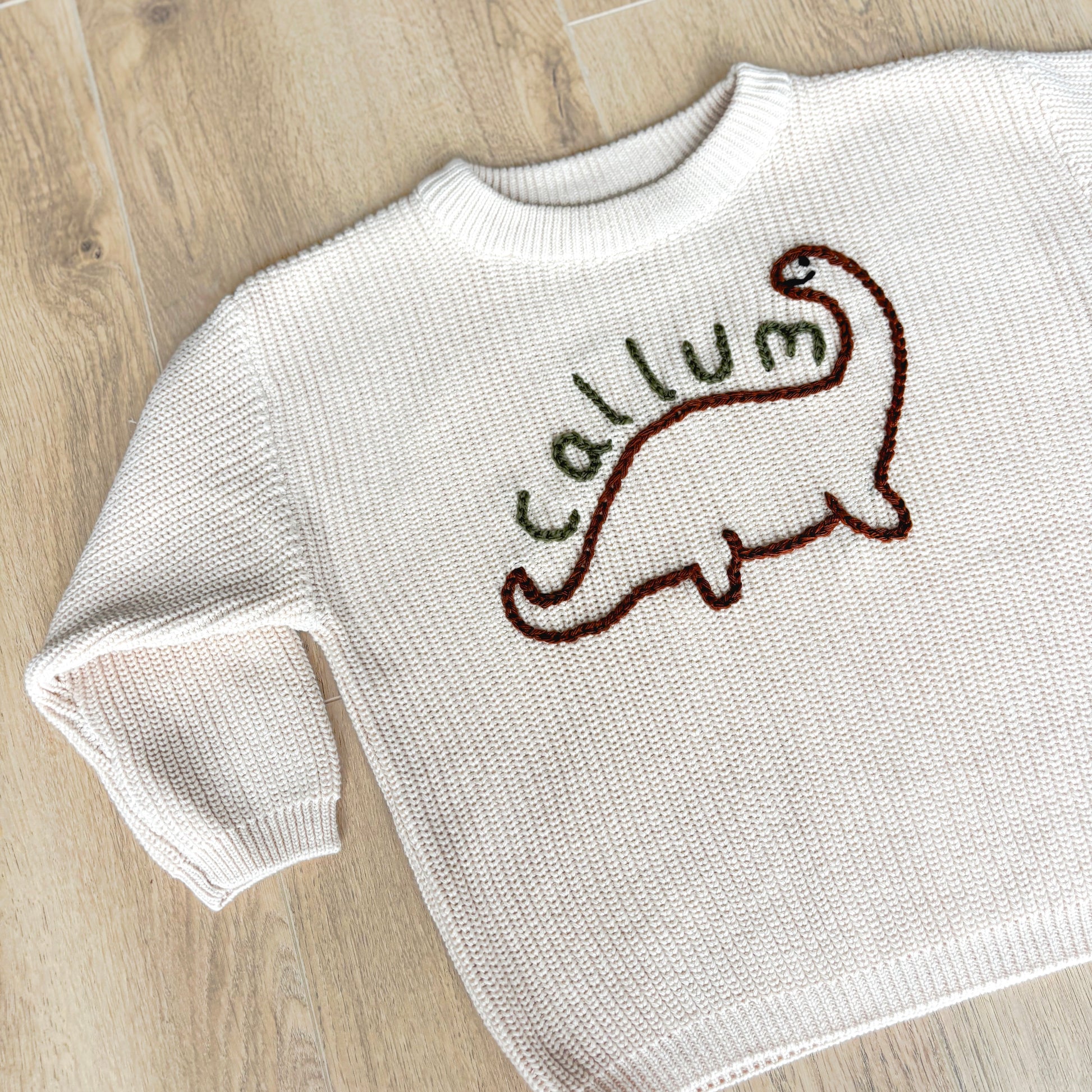Each jumper is entirely hand-embroidered with every stitch, curve, and detail lovingly crafted to create a piece that feels warm, playful, and truly one-of-a-kind. The earthy tones and gentle raised embroidery brings the dinosaur to life, making this a keepsake your child will treasure.