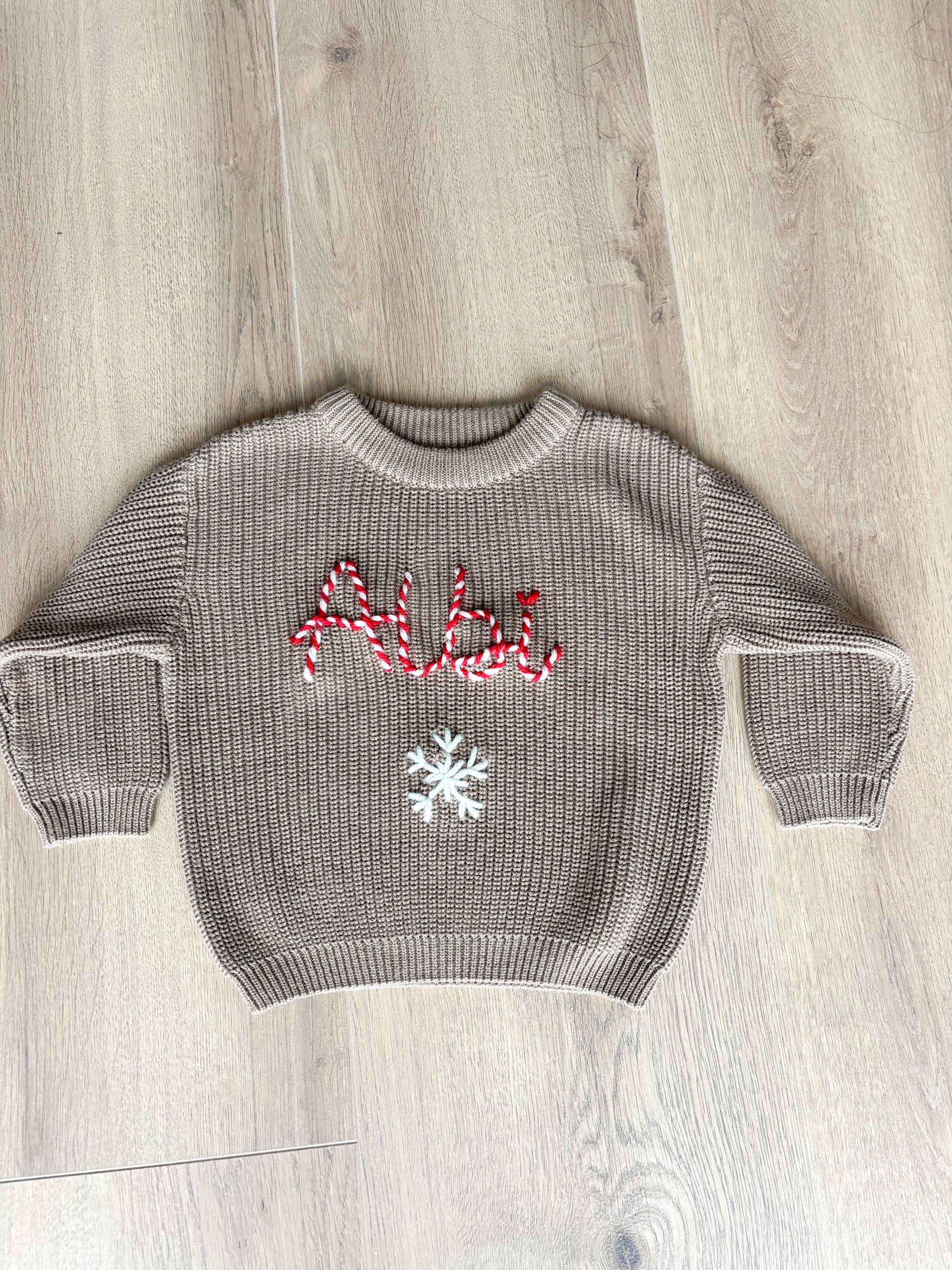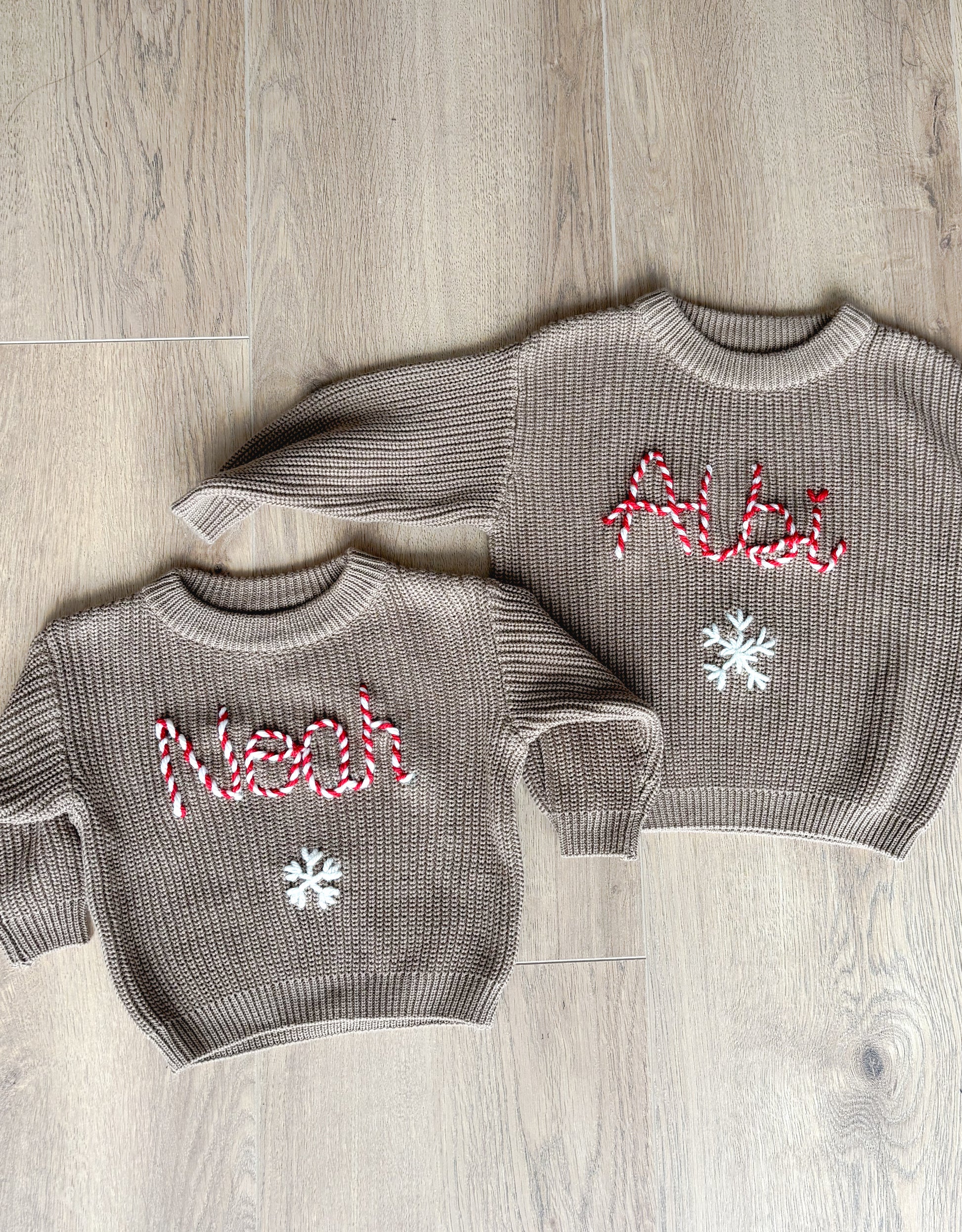 Wrap your little ones in festive magic with our hand-embroidered Christmas jumpers, crafted with love, personalised with their names and adorned with candy canes and snowflakes.