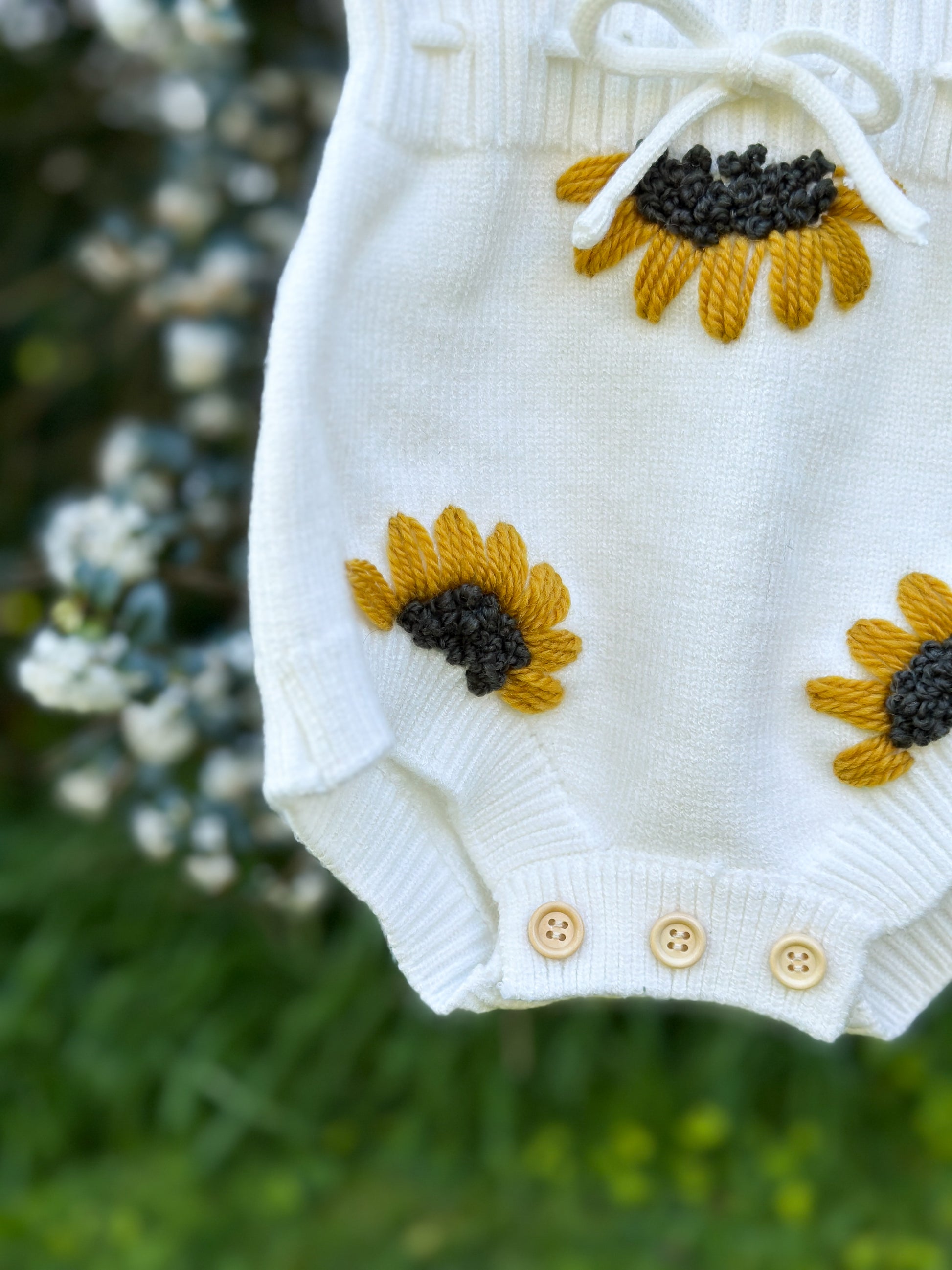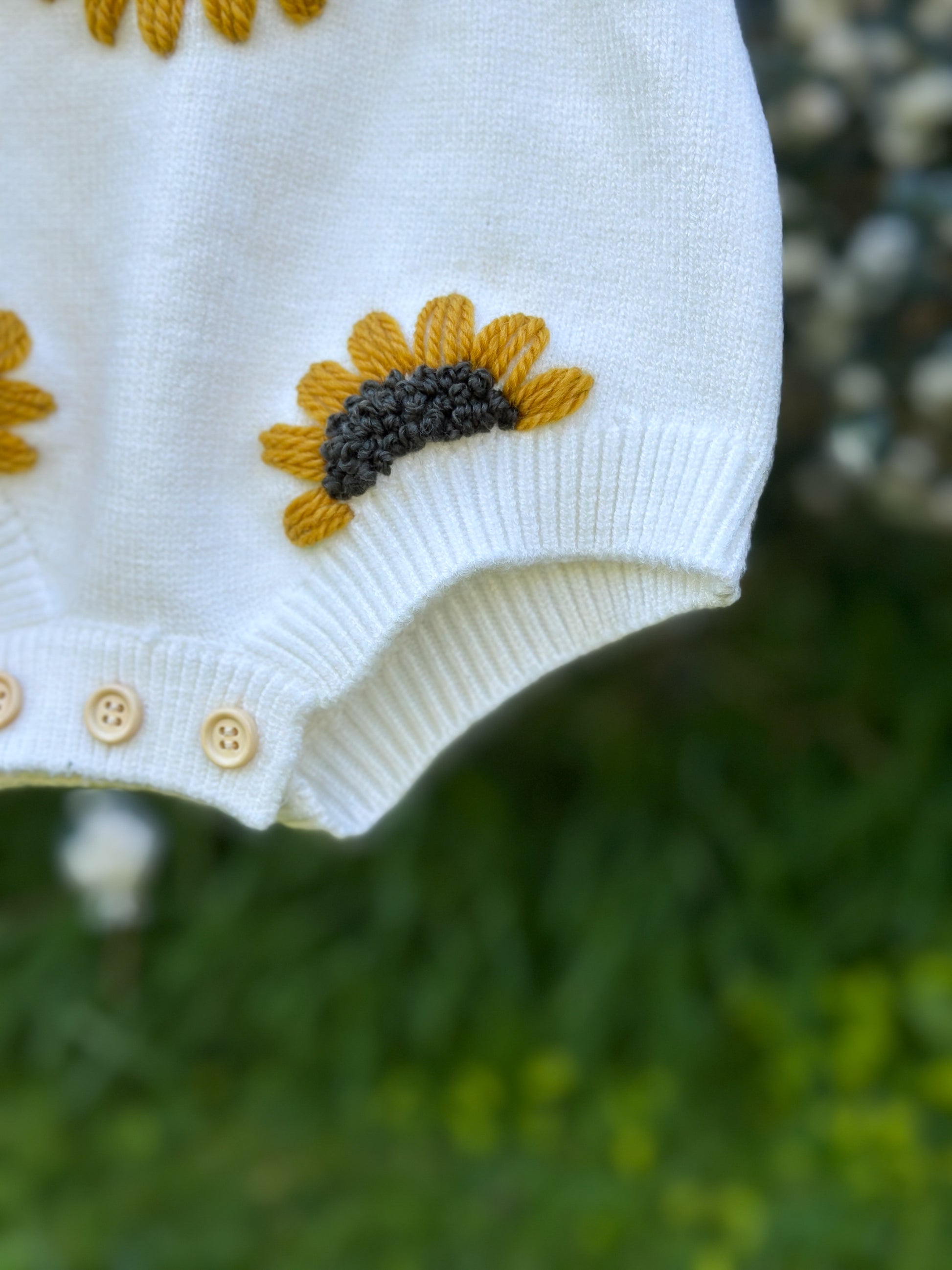 Bring sunshine to your little one’s wardrobe with this hand-embroidered sunflower romper. Crafted from the softest knit, it features bright sunflowers and a tiny bee — symbolising joy, warmth, and new beginnings. Personalised with your baby’s name for a truly one-of-a-kind keepsake.