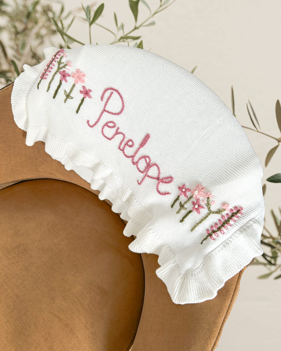 Each blanket is finished with delicate ruffle edges and hand-embroidered with your baby’s name in our signature hand-written font. Blooming wildflowers in soft pinks and greens frame the embroidery, creating a timeless piece that feels as precious as your little one.